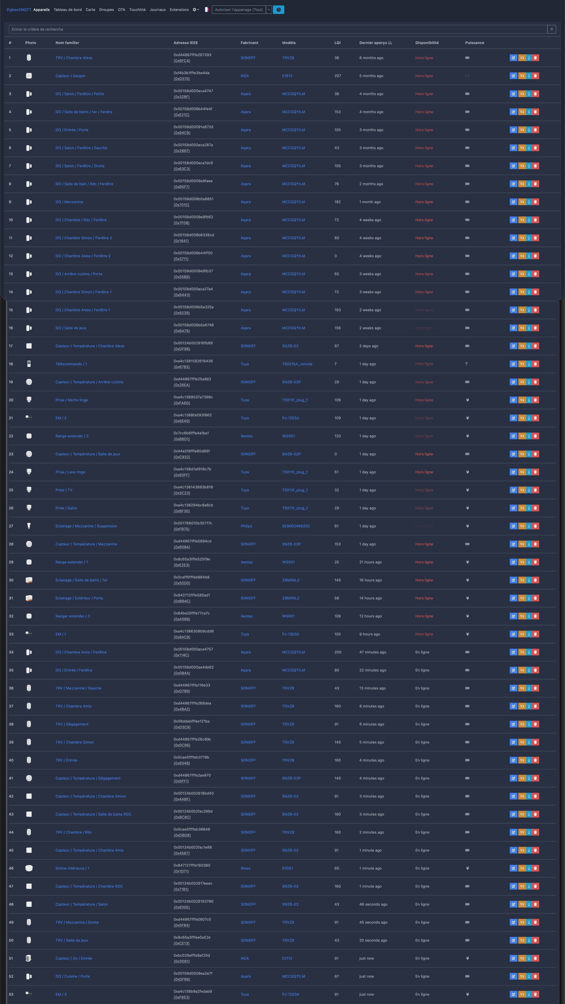 C’est tout le problème, si je regarde pas à intervalle régulier des équipements tombent. Les deux à 5 et 6 mois c’est de mon fait. Les autres, ce sont ces foutus MCCGQ11LM de Aqara qui, a intervalle régulier, ne donnent plus signe de vie. Est-ce que mettre une passerelle Aqara ne serait pas plus efficace ? Vous avez ces devices de votre côté ?