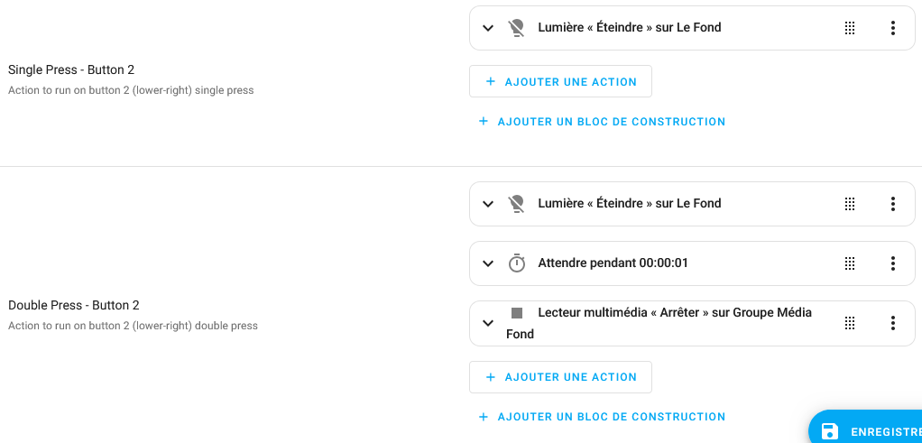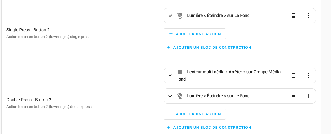 j’ai créer une commande qui demande : sur double appuie d’un bouton, alors fait 2 actions ( éteint les lumières d’un groupe + éteint la musique d’un groupe de GH)