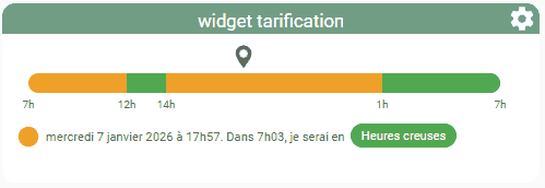A partir de ces règles, j’ai donc concu la carte suivante permettant da’fficher en temps réel la ou les plages d’heures creuses (et d’heures super creuses le cas échéant) en fonction de ce qui vous aura été imposé par Enedis (la ou les plages sont indiquées sur vos factures et votre contrat d’électricité). La carte permet donc de saisir votre ou vous plages et de les mémoriser dans un input_text (nommé « input_text.widget_tarif »). Un deuxième input_text nommé « input_text.widget_tarif_backup » permet d’annuler une configuration en cours de saisie si nécessaire. La configuration initiale de la carte se fait en cliquant sur l’engrenage en haut à droite de celle-ci.