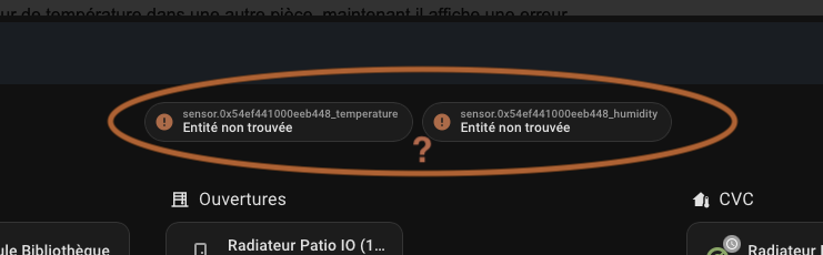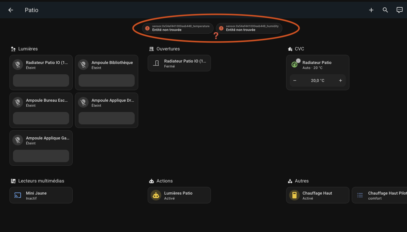 Ce capteur était avant dans la pièce Patio qui affiche l’erreur en haut pour la temperature et l’humidité non trouvées :