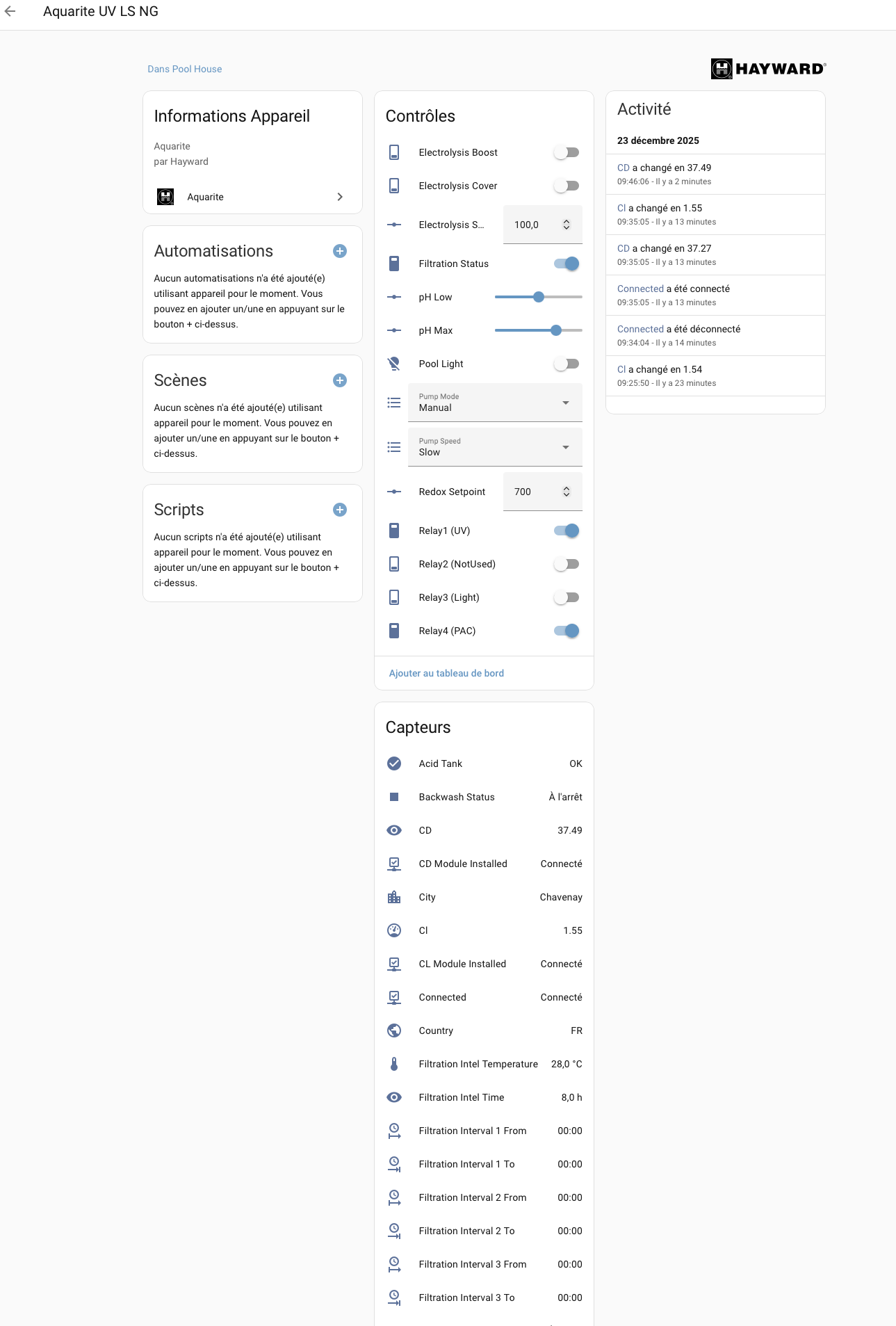 Pour l’intégration HACS, c’est un électrolyseur de chez Hayward Aqauarite qui affiche une quantité très importante de paramètre :