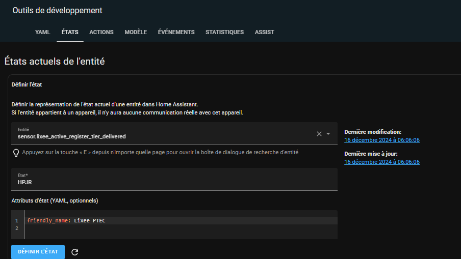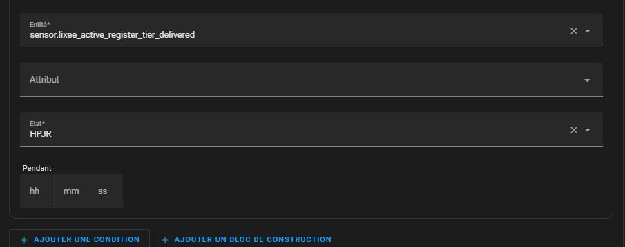 : si l’entité « sensor.lixee_active_register_tier_delivered » égale « HPJR » alors la régulation reste a « 0 » soit condition different de « HPJR » pour fonctionner