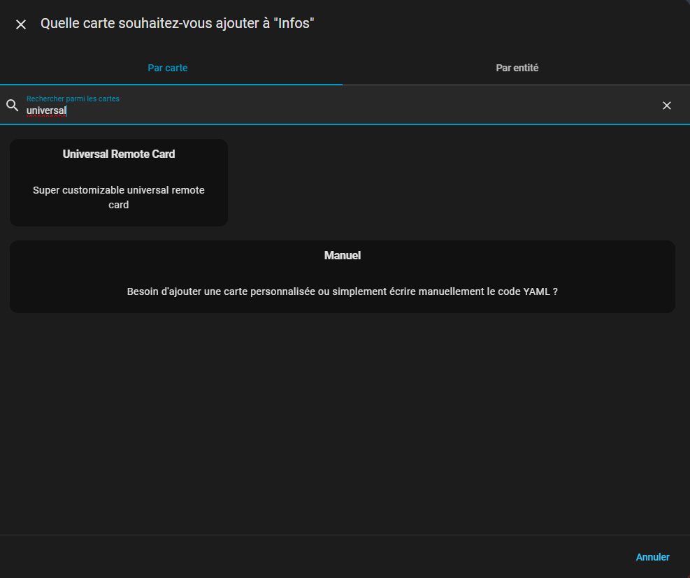 A priori tu fais comme avec toutes les cartes via l’UI, tu vas sur ton dashboard, edition ( le crayon en haut à droite), ajouter une carte et tu cherches avec TV ou remote