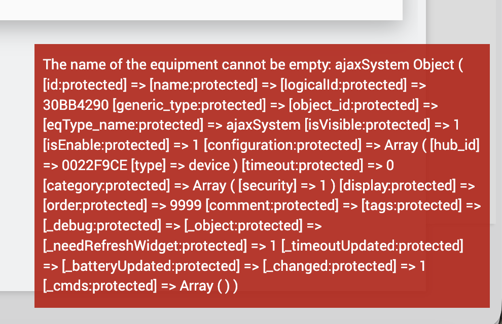 Depuis le 30/12/2025, je rencontre cependant un problème : le plugin Ajax dans Jeedom ne parvient plus à synchroniser l’ensemble des équipements depuis le cloud Ajax. Seuls quelques équipements sont détectés, puis le processus de synchronisation s’arrête et remonte une erreur (voir capture d’écran jointe).