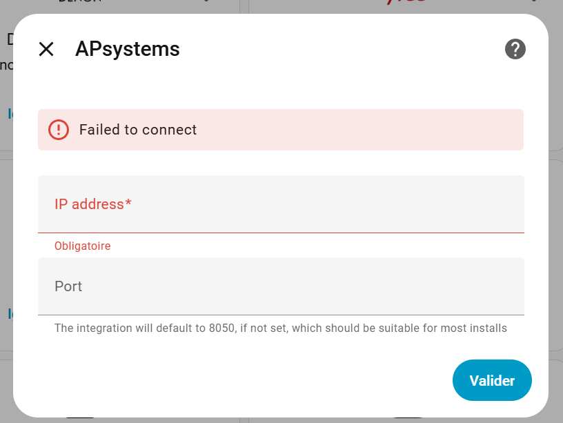 je suis nouveau sur HA, je voulais intégré mes µonduleur EZ1, mais lors de l’intégration il me demande l’adresse IP et les Ports mais j’ai le messasage d’erreur :