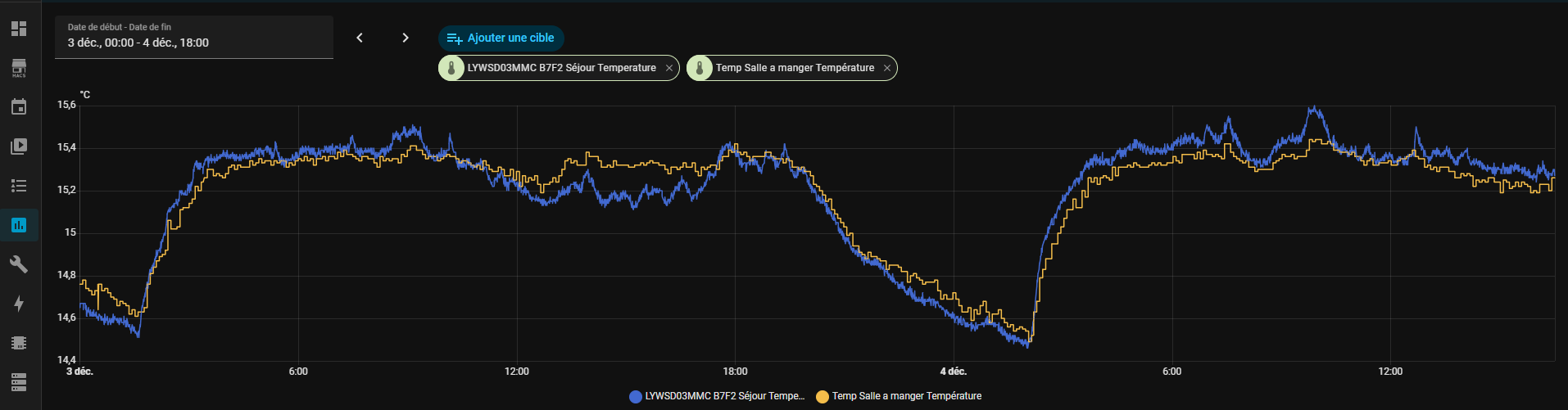 Sur ces courbes on voit en bleu la moyenne de ces deux capteurs, en vert, la sonde Aqara Zigbee dans la même pièce qui réagit très très lentement.
