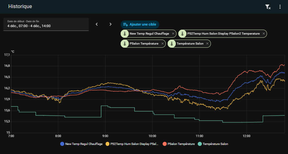 Mon chauffage je le pilote (déjà dit mais…) sur la moyenne de deux capteurs AHT10 montés sur ESP32 et situés en opposé dans ma pièce principale. Chauffage gaz sans tête thermostatiques connectées.