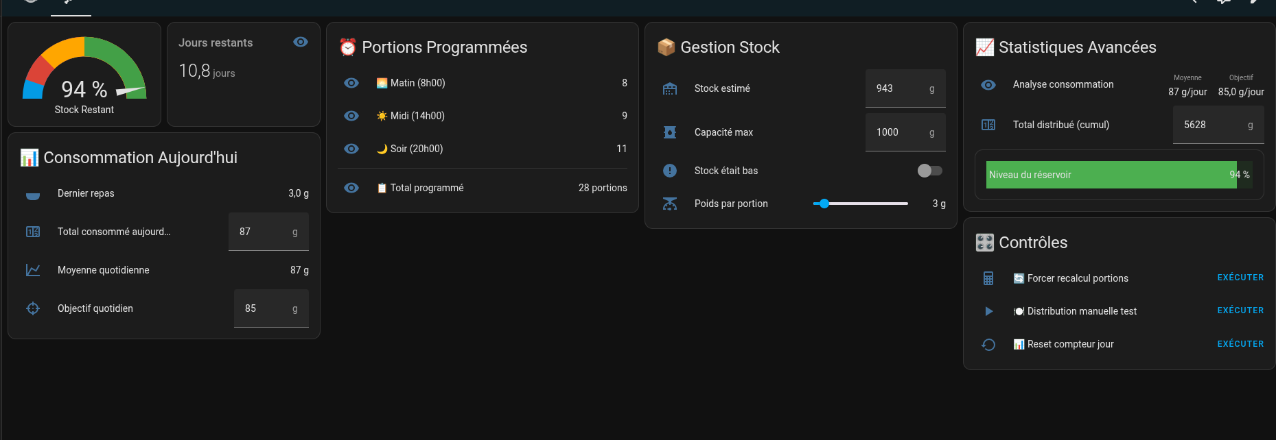 Et tout ça pour en arriver à calculer, le poids restant, le nombre de jours avant épuisement du stock. Le calcul des portions a donner suivant l’heure du repas, et encore d’autres choses.