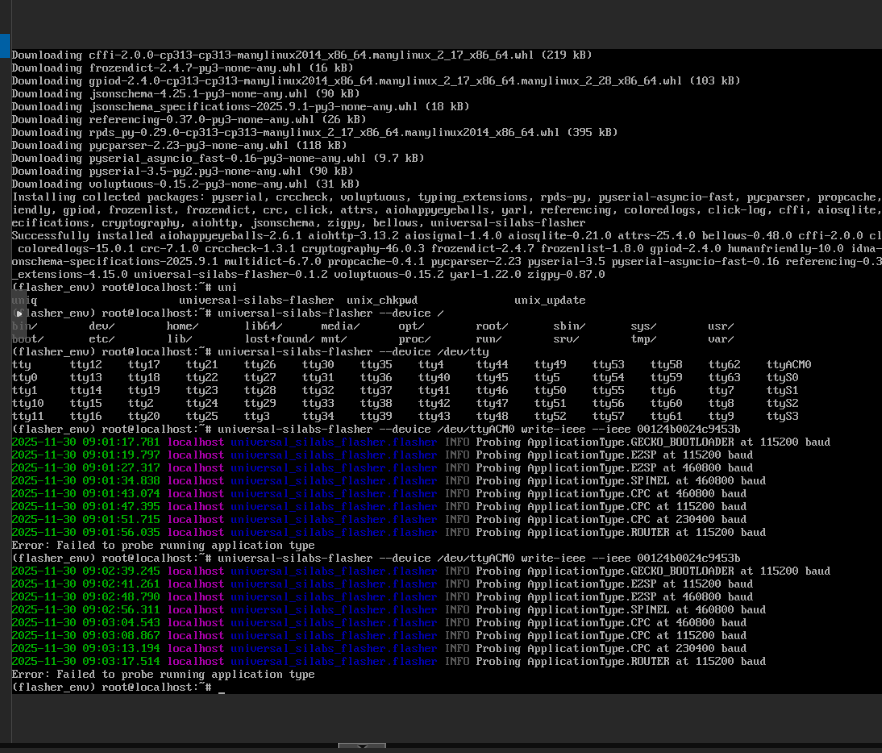 python3 -m venv flasher_env source flasher_env/bin/activate(L’invite de commande affiche (flasher_env) root@....)pip install universal-silabs-flasher0011223344556677 par l’adresse IEEE notée à l’étape 1.B.universal-silabs-flasher --device /dev/ttyACM0 write-ieee --ieee VOTRE_ANCIENNE_ADRESSE_IEEE(Note : Le port /dev/ttyACM0 doit correspondre au port sous lequel la clé apparaît dans la VM Linux de flash.)Une fois la clé flashée, revenez sur votre VM Home Assistant.