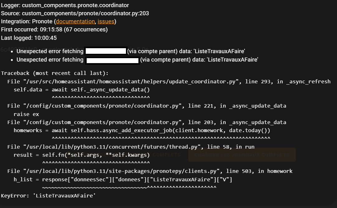J’ai dû modifier mon intégration pour qu’elle fonctionne. J’ai rajouté un try : exept: sur les devoirs pour continuer le log s’il y à une erreur.
