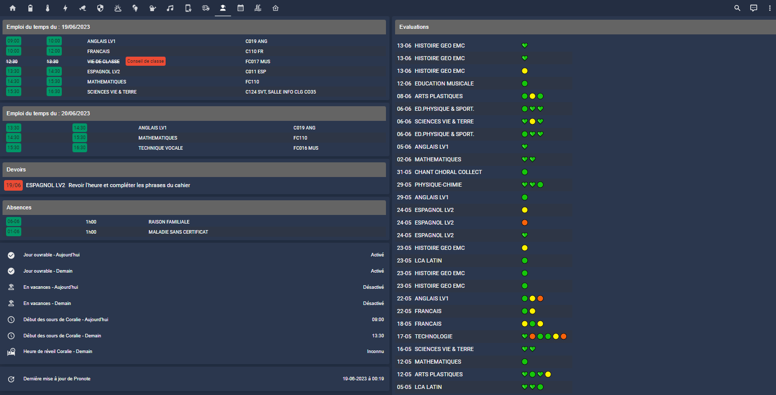 Pas de soucis pour voir les devoirs, absence, planning,ect sur Pronote directement.