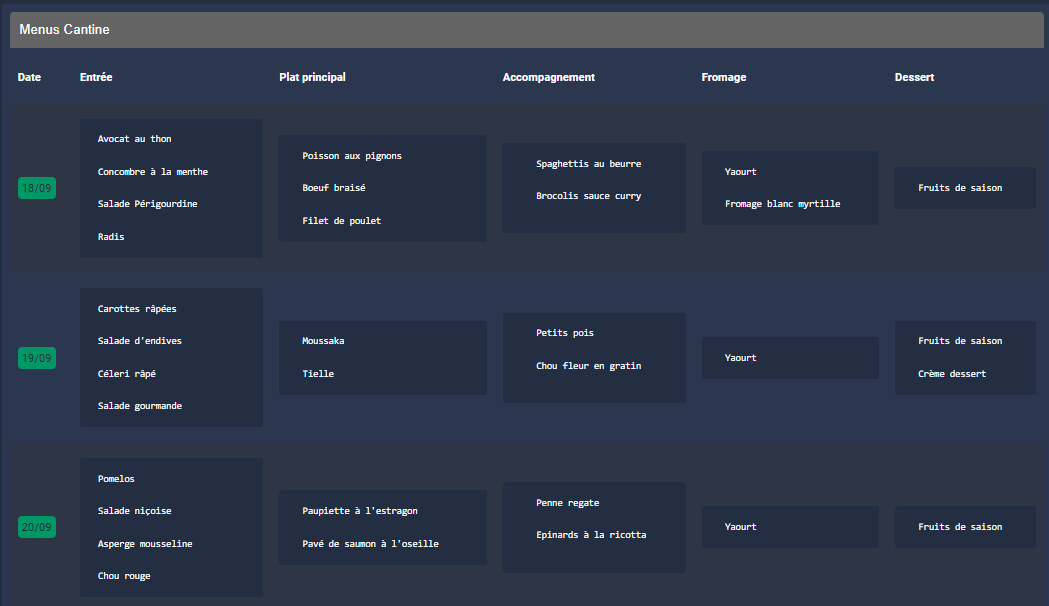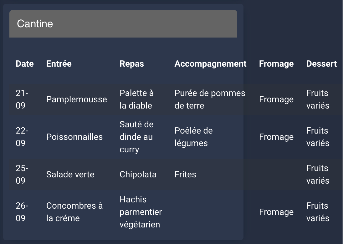 je pense que c’est la meme erreur que j’avais , regarde plus haut dans la discution , j’ai mis ma carte cantine modifiée qui justement ne genere pas d’erreur quand un plat est manquant