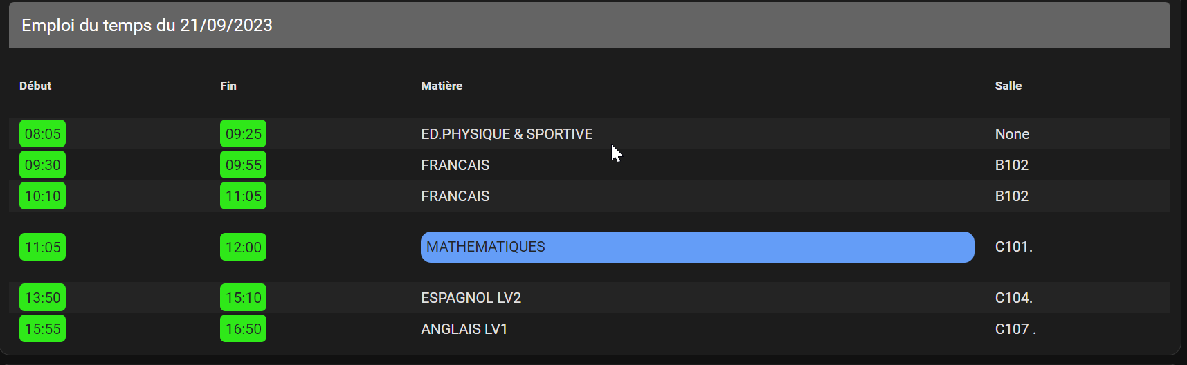 ci dessous une carte emploi du temps dynamique qui met en evidence le cours actuel : (surlignage en bleu de la matiere) (ce n’est pas a l’instant T mais basé sur le dernier raffraichissement de pronote (tous les 1/4 d’heure)