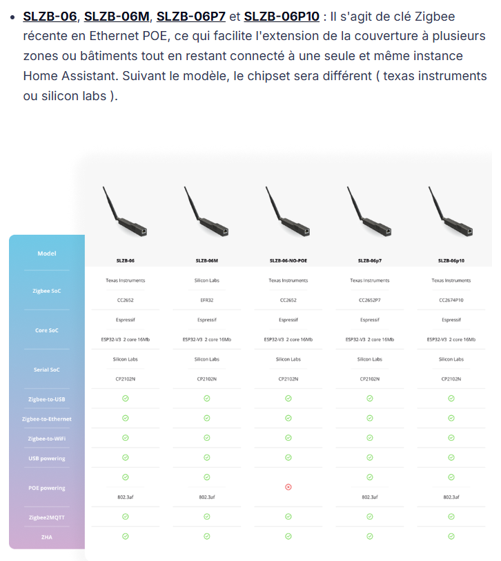 Depuis la sortie de cette article, de nouveaux adaptateurs POE sont “sorti” et son pris en charge par Z2M, je pense plus particulièrement au SLZB-06MG24 et au SLZB-06MG26 qui a ce que j’ai compris sont basé sur des chipset radio plus “puissant” (plus de RAM/ROM) et qui sont à peine plus cher que le SLZB-06M (respectivement 8 euros et 14 euros de plus)