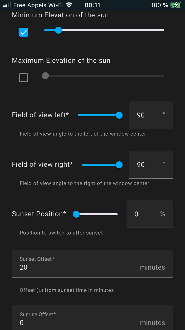 Sur mes volets donnant plein ouest j’ai configuré « Minimum elevation of the sun » à 9 en me disant que lorsque le soleil est à une élévation inférieure à 9°, l’automatisation n’est plus prise en compte et le volet remonte à la position par défaut (100% ouvert pour moi). Malheureusement pour le moment, le volet ne remonte que lorsque l’élévation passe sous 0°. Une idée ?