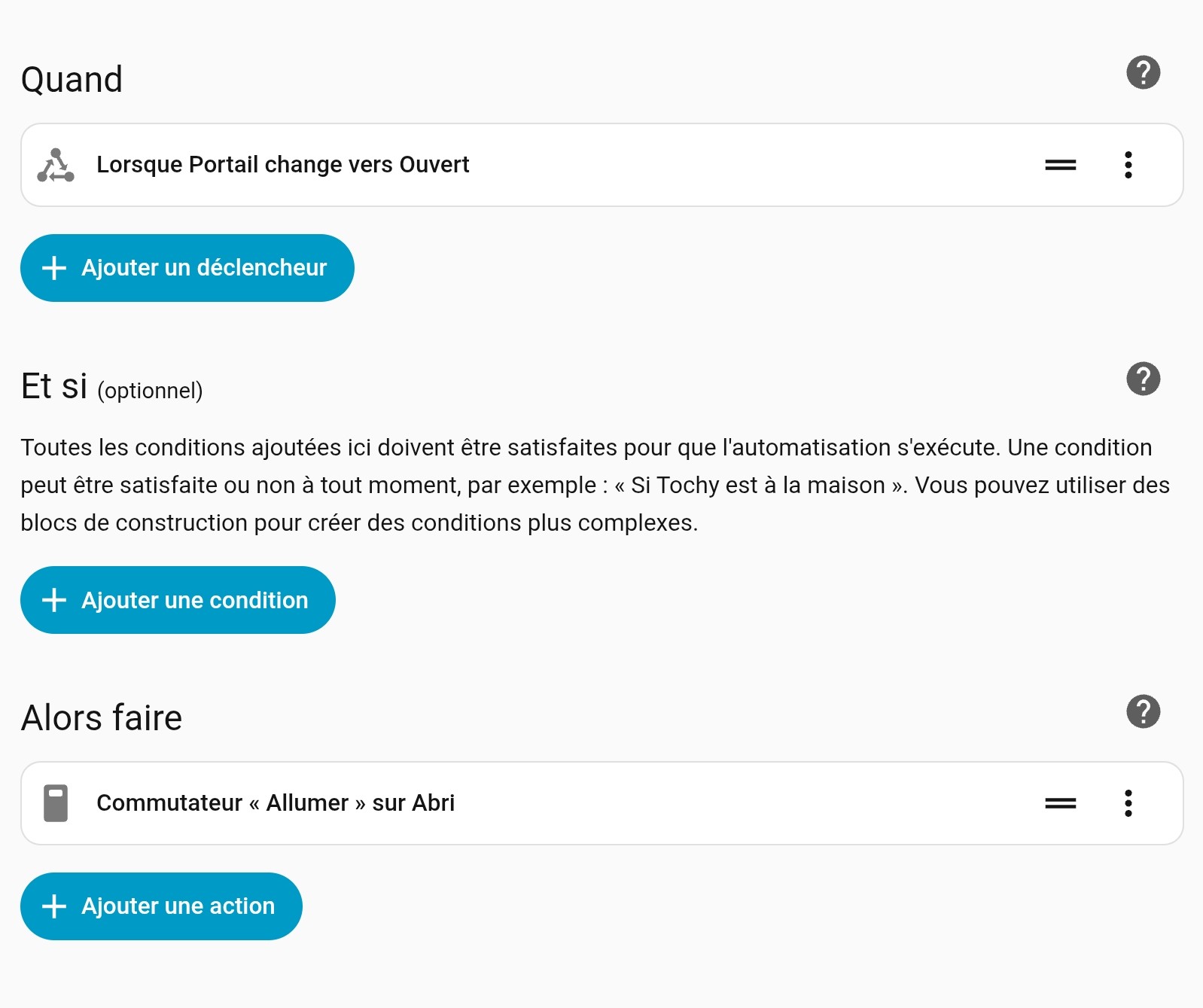 Bonjour, je souhaite créer une automatisation qui lorsque le garage s’ouvre, la lumiere du garage s’allume. Si la lumière est déjà allumé on fait rien , si le garage se ferme on fait rien non plus !