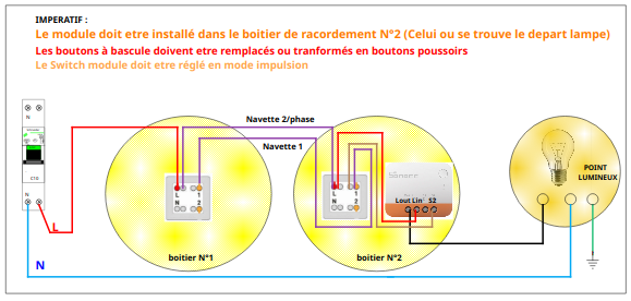 L’idée est d’utiliser les deux fils navettes existants pour ramener la Phase vers le module et créer la boucle de commande.