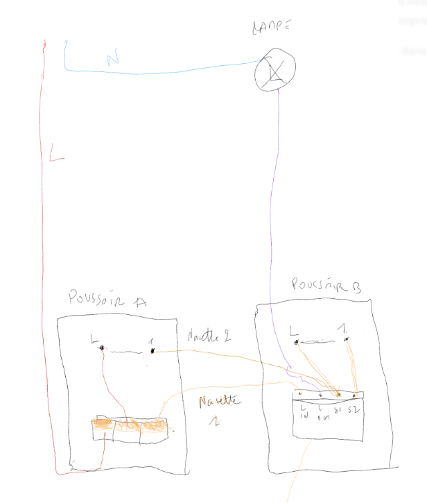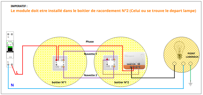 - Boîte B : Là où se trouve le Retour Lampe (fil orange ou violet qui va vers l’ampoule). C’est ici que vous placerez le module Sonoff.