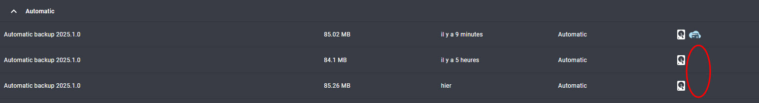 J’utilise depuis la mise à jour 2025.1 le module de backup automatique. Toutefois, j’ai un message d’erreur pour le backup automatique programmé à 4h45 dans le cloud Nabu. Celui ci ne se fait pas. Tout semble bien paramétré. J’ai bien un compte cloud. Si je lance manuellement un backup dans la journée, tout se passe bien mais le problème survient pour le backup de 4h45.