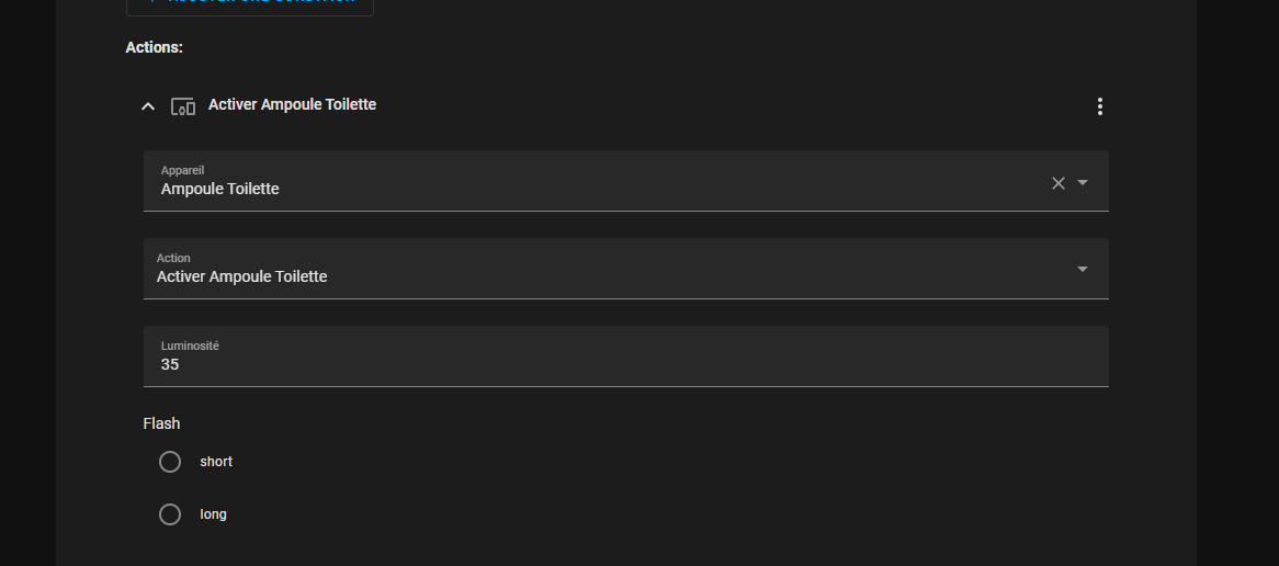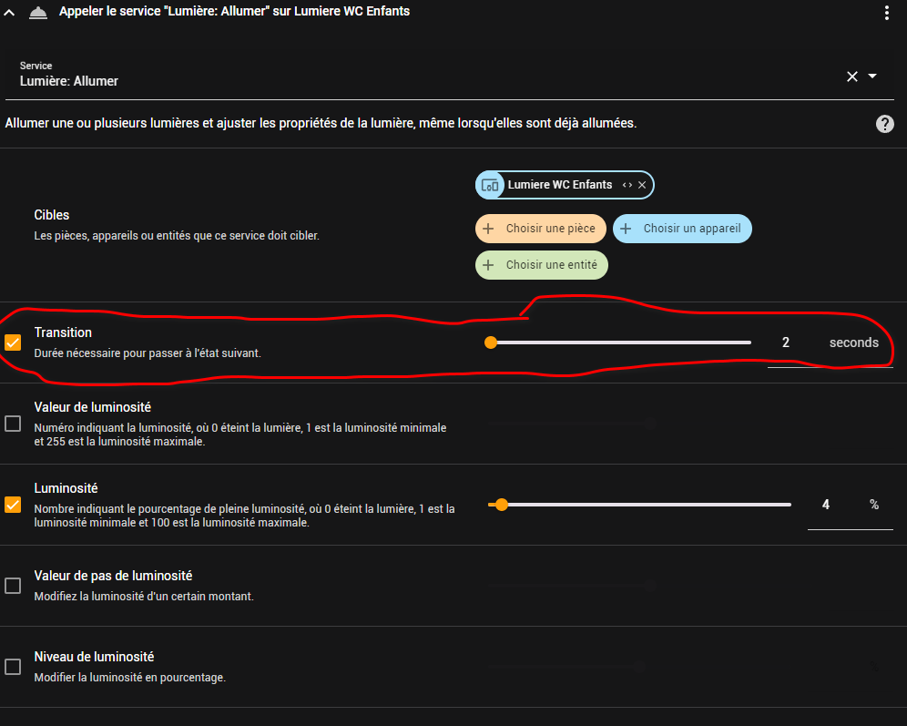Pour ma part, afin d’éviter le « Flash » avant que l’ampoule ne prenne la bonne luminosité, j’ai ajouté une transition de 2 secondes sur mon service light.turn_on