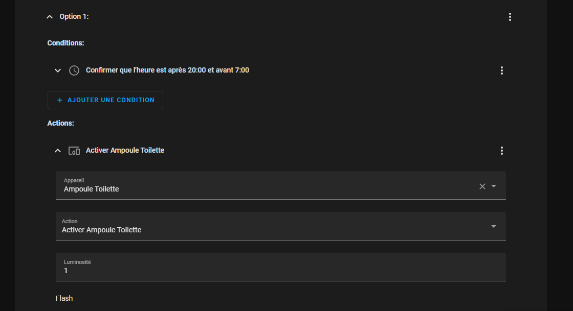 je veux éviter un allumage/set luminosité/extinction aux heures de changement de luminosité car si l’ampoule est allumée avec quelqu’un dans la pièce ca va être le souk et que je veux pouvoir étendre çà à d’autres automatisations comme les couloirs ou autres.