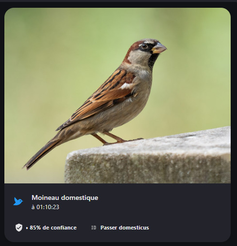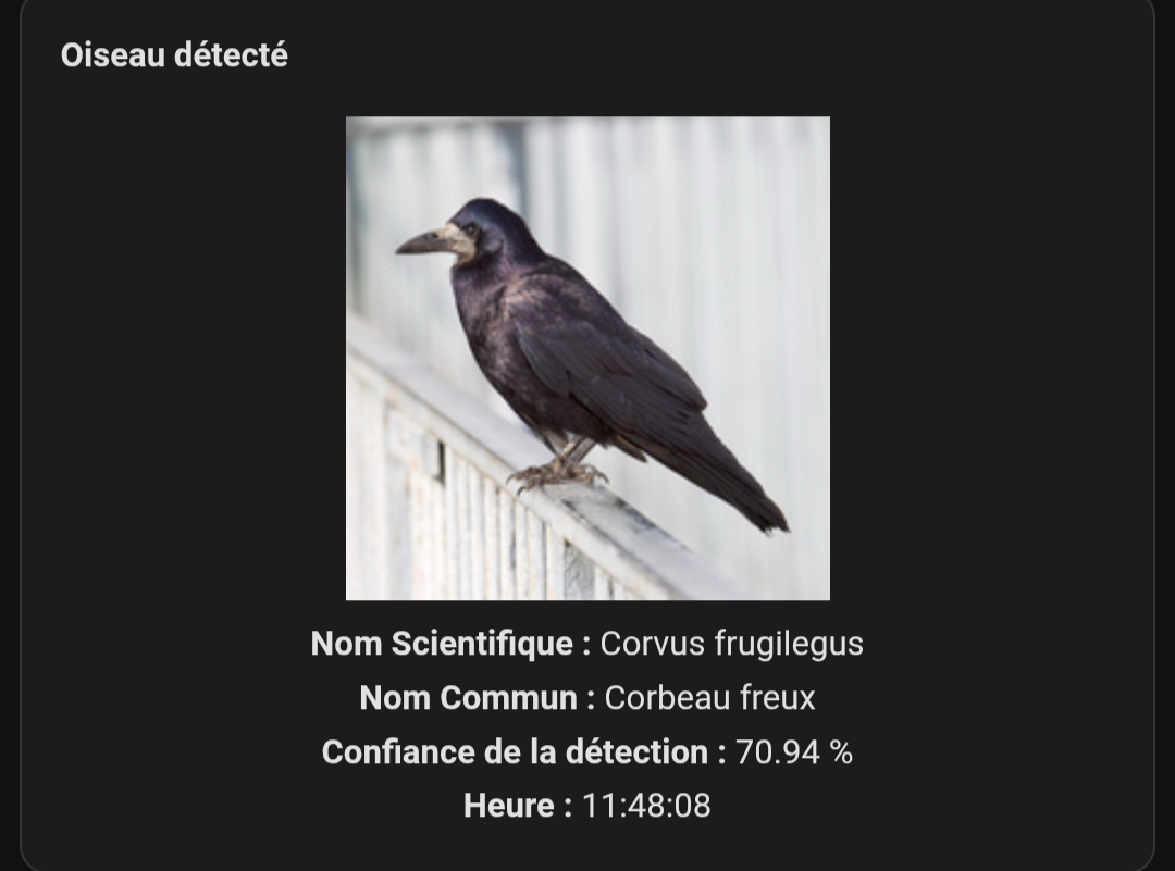 <center> <b>Nom Commun :</b> {{ states('sensor.derniere_detection_d_oiseau')