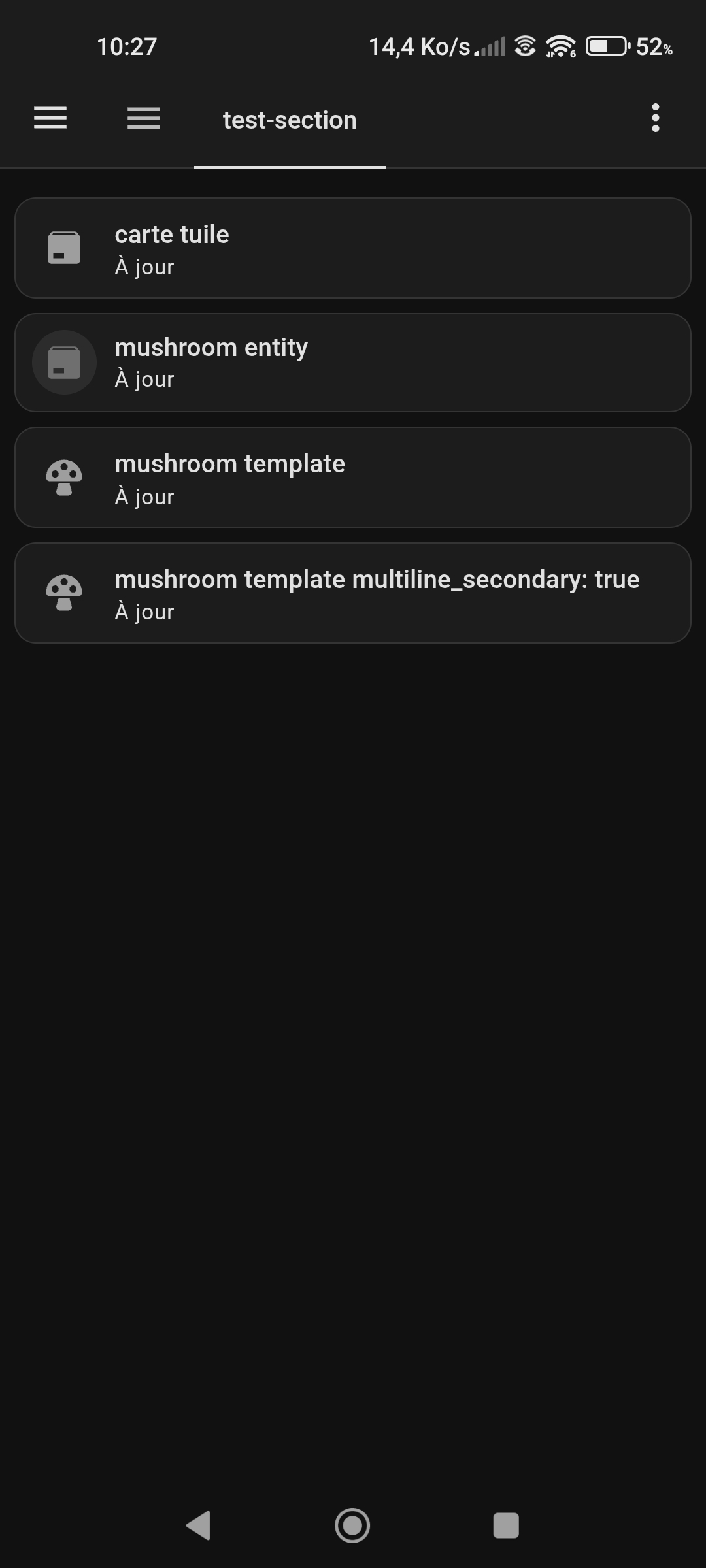 Là on se rend bien compte que seule la carte template avec multiline_secondary: true n’est pas impactée et que les 3 autres sont réduites plus ou moins en hauteur, le texte de la seconde ligne touchant carrément la bordure pour la tuile et la template normale.