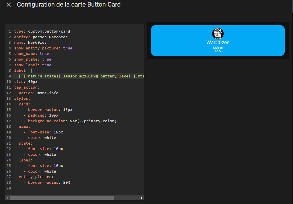 Je voudrais créer une button card avec l’affichage de la batterie de mon telephone (pour l’instant). J’ai bien telecharger la button card , j’arrive à avoir ma localisation mais pas l’infos sur la batterie.