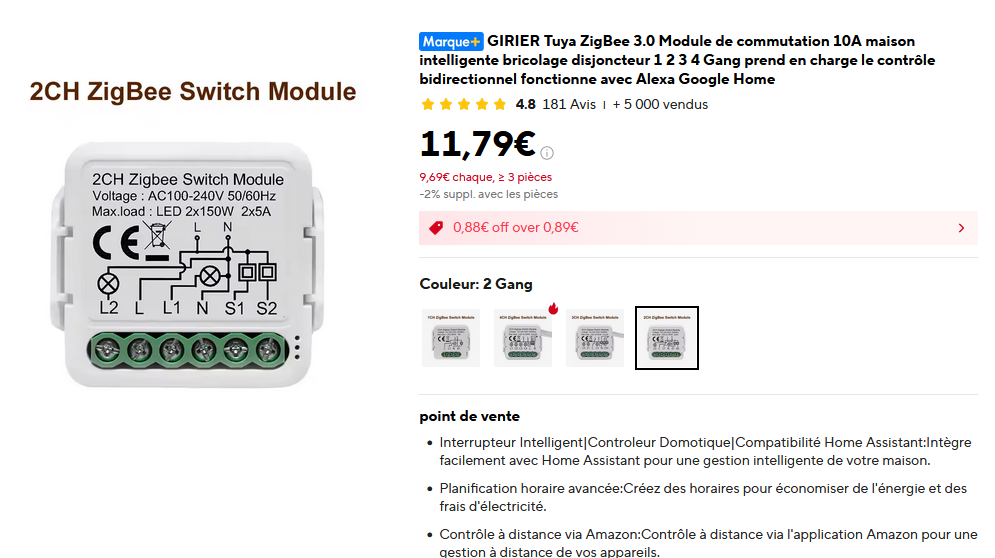 j’ai d’autre circuit de lumière avec les même specs (module zigbee+spot moes zigbee) mais un autre modele de module GIRIER / Tuya 2CH ZigBee Switch Module 10A** (photo “2CH ZigBee Switch Module”)
