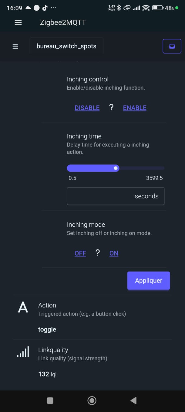Quand Zigbee2MQTT publie une action "toggle" pour bureau_switch_spots,