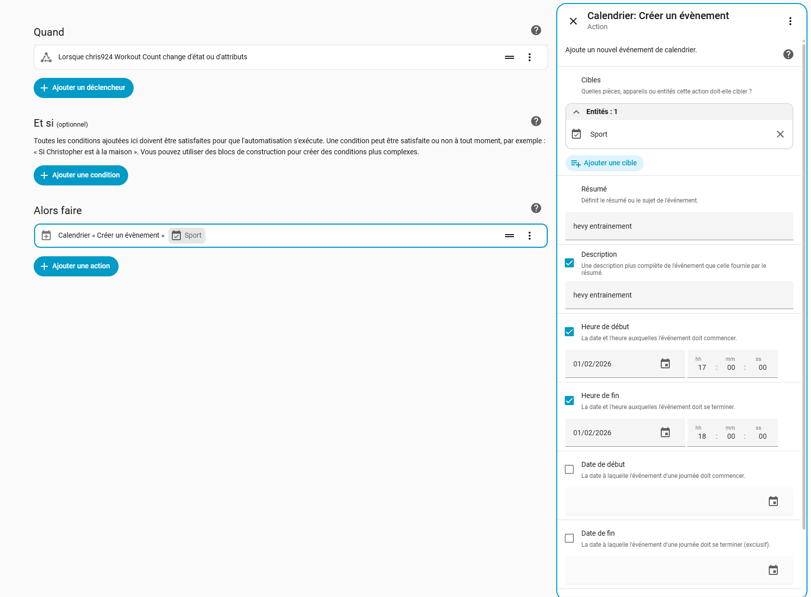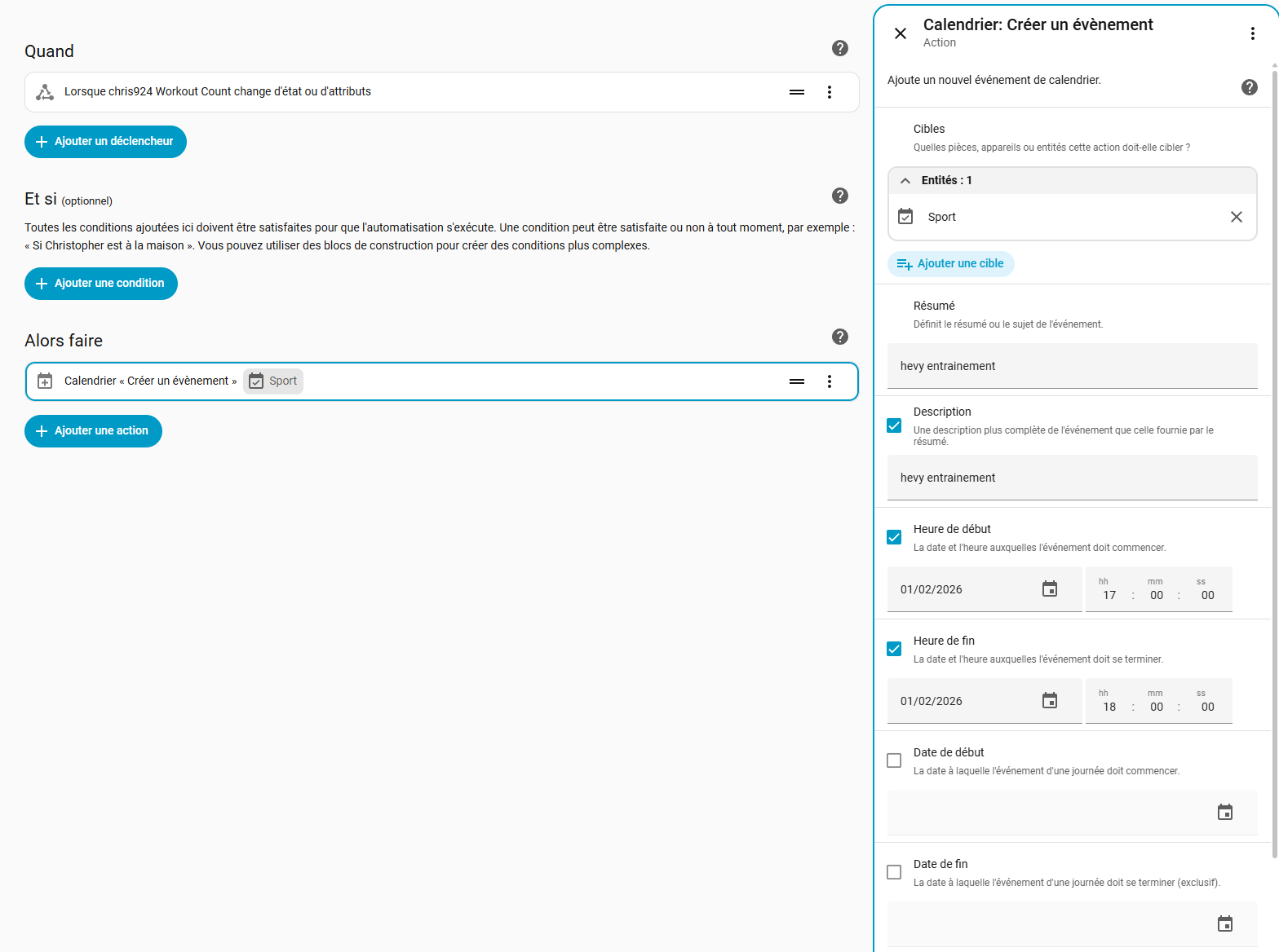 Edit 3 : j’ai réussi à créer une automatisation qui créer un évènement le 1 février lorsqu’il y a un changement dans le nombre d’entrainement.