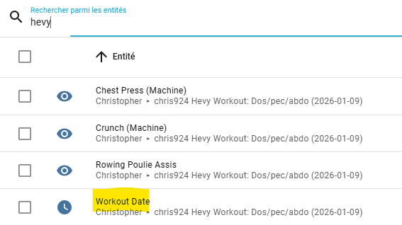 Sur celui-ci je voudrais faire remonter automatiquement mes entrainements que j’enregistre sur l’application « Hevy » que j’ai également ajouter sur HA et je vois bien dans les entités mes entrainements