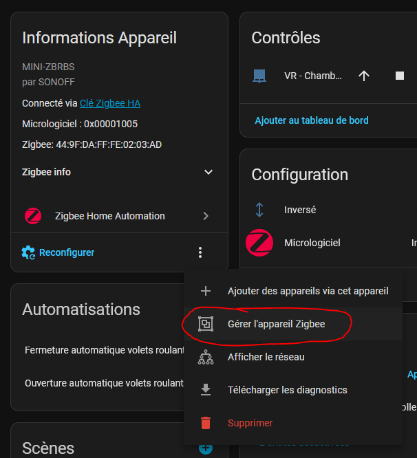 Côté HA l’intégration avec ZHA est instantanée. Je peux piloter les volets roulants en appuyant physiquement sur les boutons ou via HA.
