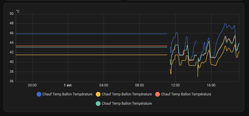 - trouver la carte qui va bien pour afficher sur un même graphique les 4 températures. La carte capteur ne permet d’afficher qu’un seul capteur, la carte statistique permet 4 capteurs sur le même graphique, mais en créant une statistique (à minima, la moyenne sur 5 minutes). Recherche une carte qui permet de créer un graphique de 4 capteurs (sans modification des valeurs) merci pour votre aide.