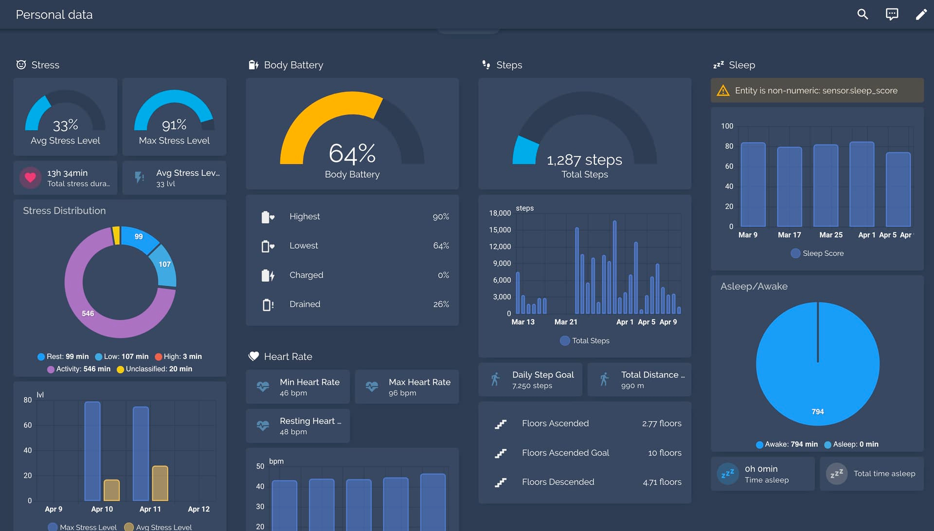 Commençant à avoir quelques capteurs santé qui remontent dans HA (en dehors du nombre de pas quotidien à mon grand regret), je suis curieux de savoir s’il existe des cartes Lovelace adaptées pour ça.