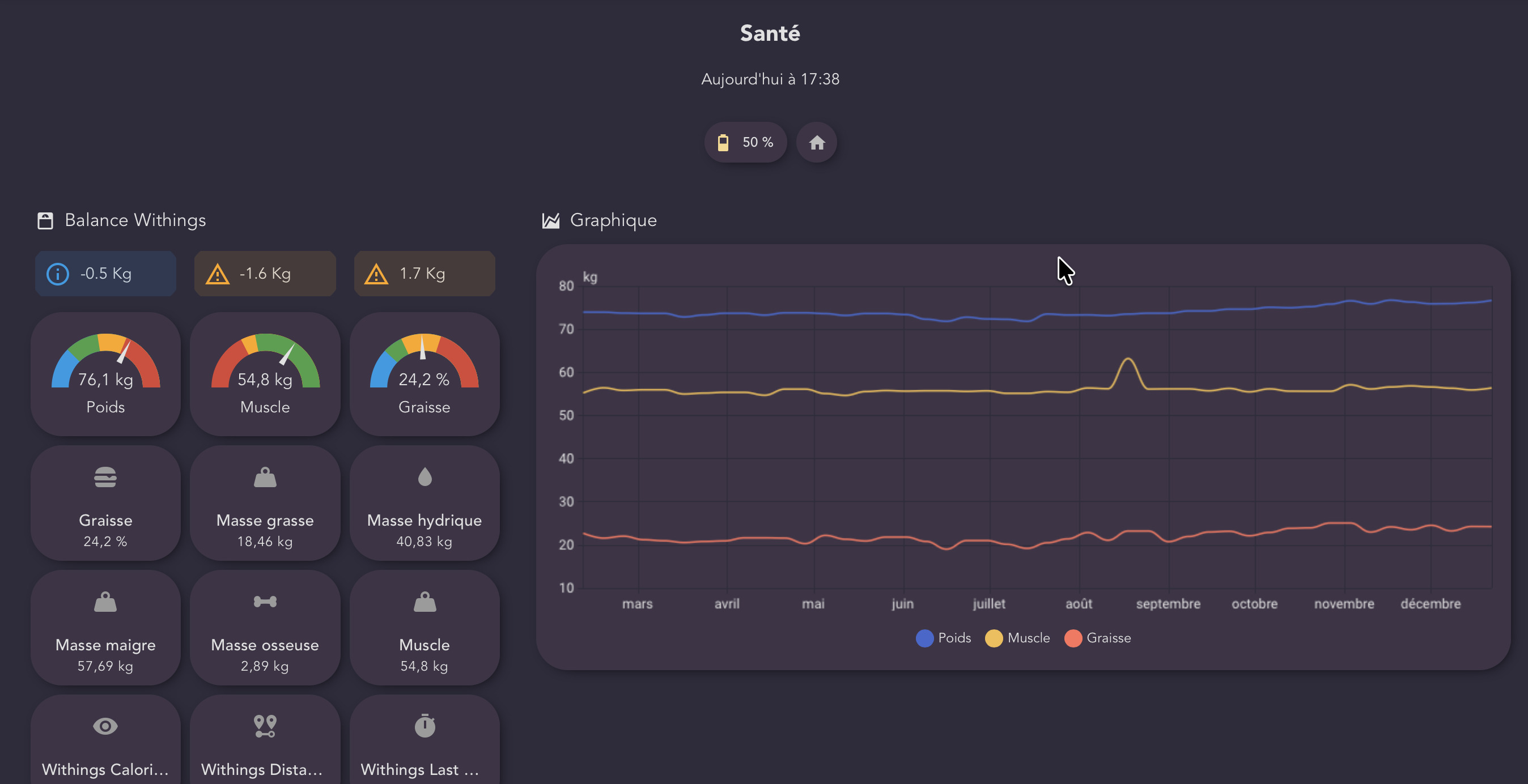 Ici j’ai rythme cardiaque, systole, diastole, poids à afficher avec dans l’idéal la possibilité d’afficher les limites ou but recherché (du style sur le poids fixer un max ou pour la systole un max à 120 pour voir facilement quand on dépasse les limites).