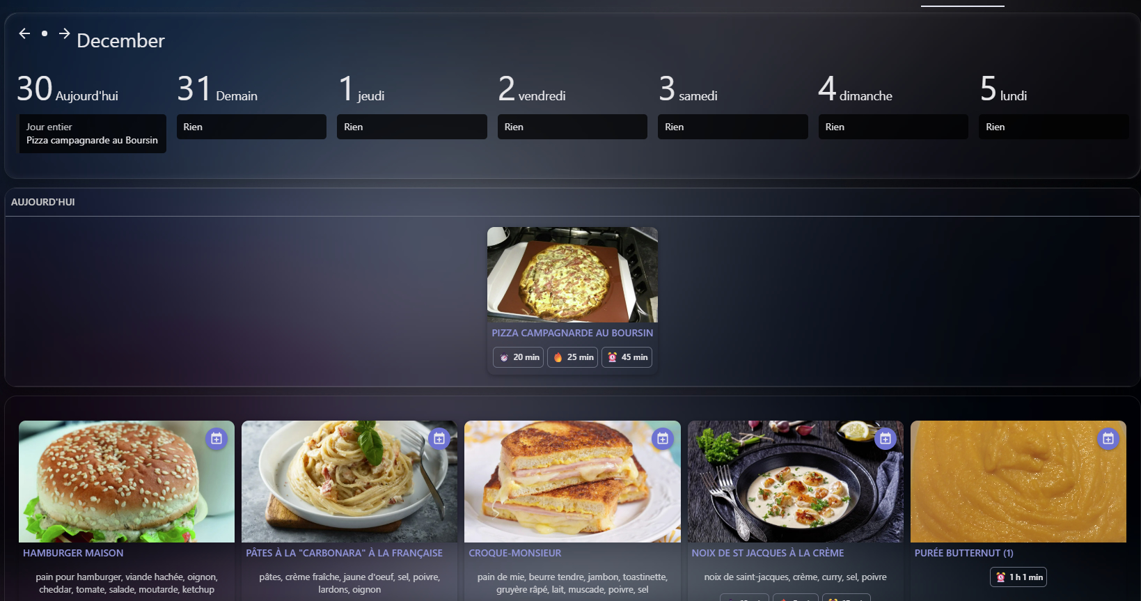 J’ai créé un page entière pour le moment où l’on voit les recettes, ce que l’on mange ce soir et le calendrier pour 7 jours