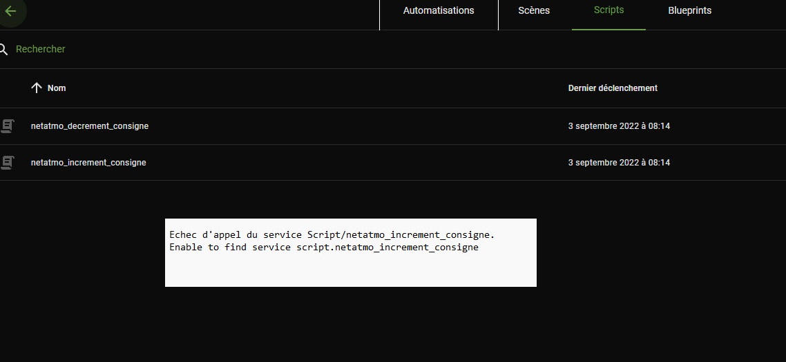 Comme ce sont les 1ers scripts que j’utilise, j’ai certainement fait une boulette, apparemment HA ne trouve pas le service correspondant aux scripts ou bien ces scripts, c’est ce que je comprend.