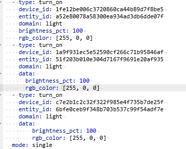 Avant je n’avais qu’une seule automatisation pour les lampes c’était juste pour les allumer/éteindre donc j’avais juste choisis leurs couleurs via Z2M . Mais maintenant j’aimerai changer la couleur en fonction de l’automatisation pour soit en verte tout les lampes rgb ou une autre couleur définies en 2 automatisations. j’ai essayé 3 façons direct dans le fichier automatisation.yaml mais ca ne fonctionne toujours pas.