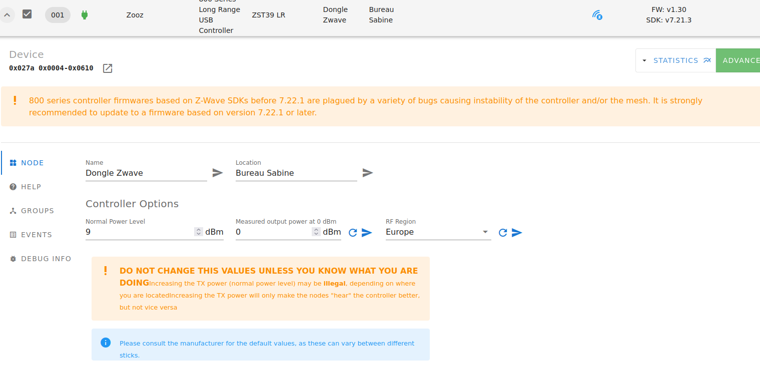 ça à l’air ok, un message d’avertissement DO NOT CHANGE THIS VALUES UNLESS YOU KNOW WHAT YOU ARE DOING Increasing the TX power (normal power level) may be illegal, depending on where you are locatedIncreasing the TX power will only make the nodes « hear » the controller better, but not vice versa