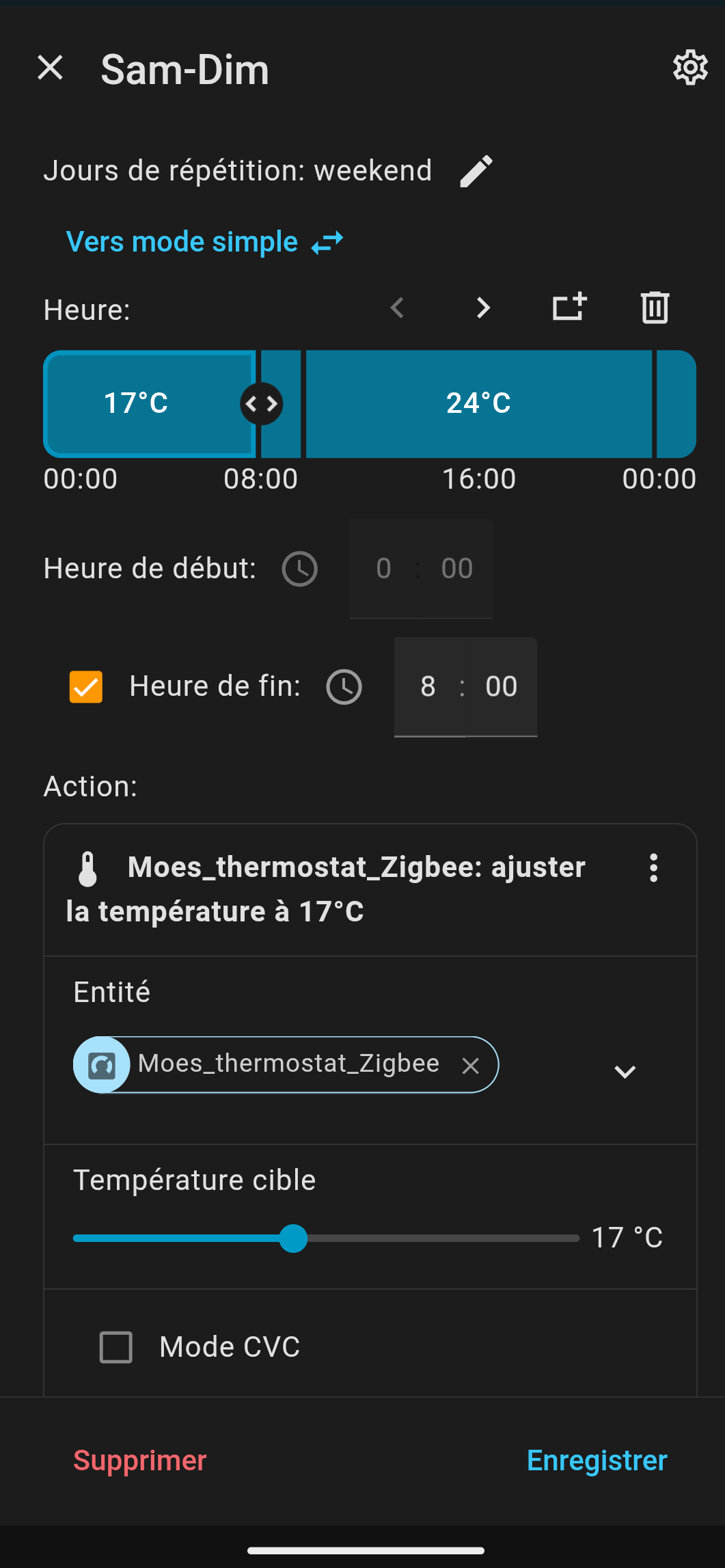 Voilà ma configuration : la température de consigne de la chambre est 17° sauf quelques heures le matin et le soir où la consigne passe à 19°.