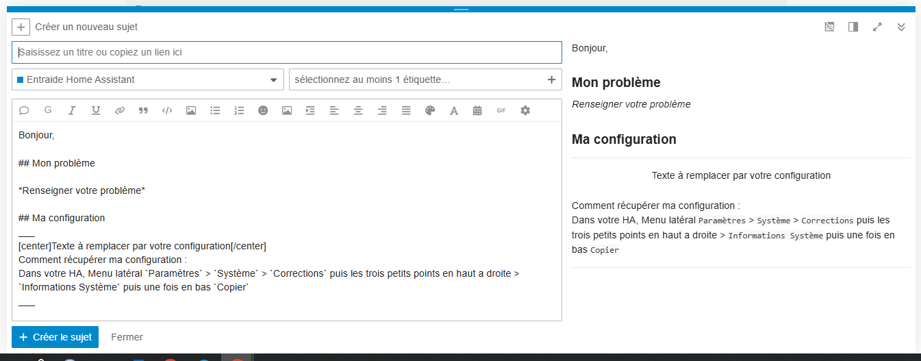 Et pourquoi ne ps ajouter un truc à la création d’un topic, en bas, au dessus de la demande de configuration, ça ‹ obligera › au moins à y jeter un oeil, au pire ça sera inefficace comme la demande de configuration …