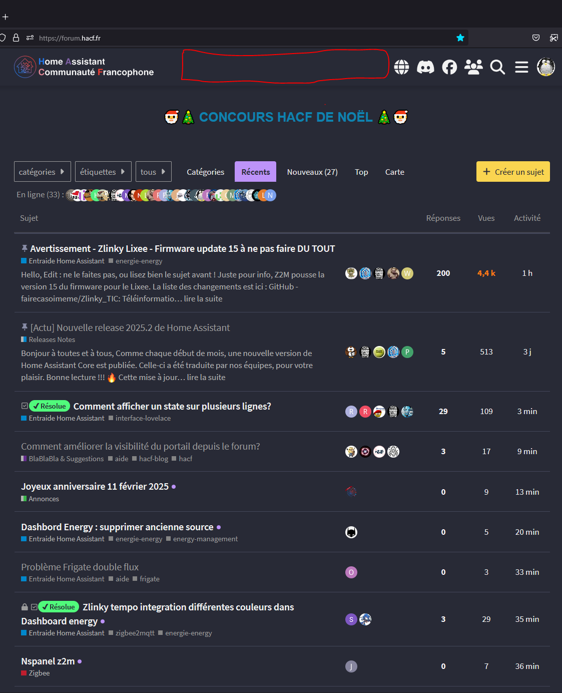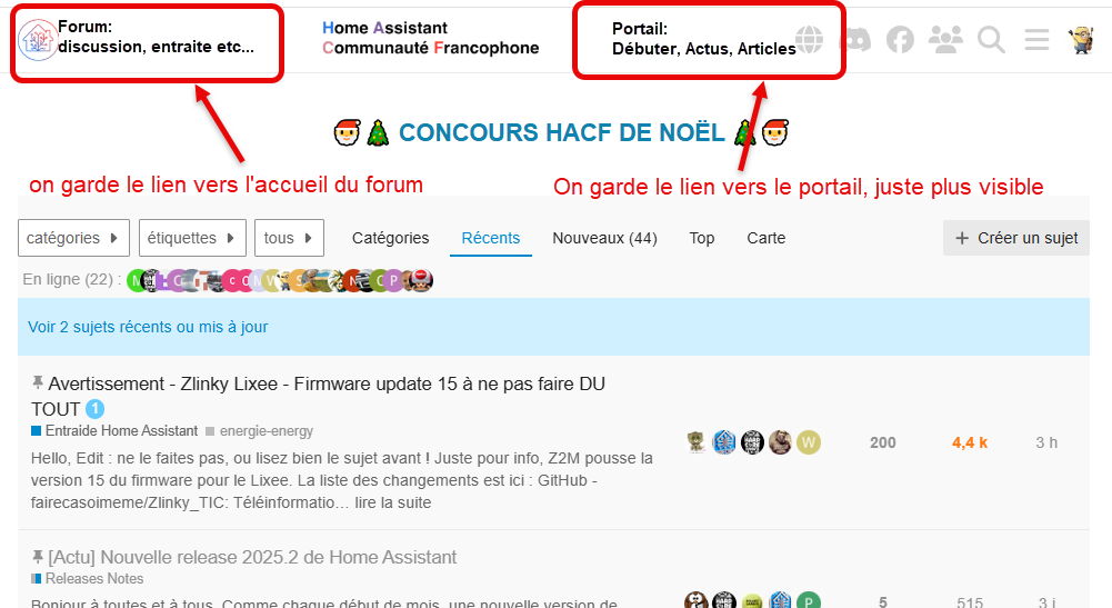 Quand je vois la page d’accueil du forum, je me dis que là ou il y’a actuellement " Concours HACF de Noel " il y aurai la place d’avoir un carrousel de vignettes renvoyant vers les articles du site, au moins les plus important et une qui renverrai vers la page des articles pour les autres.