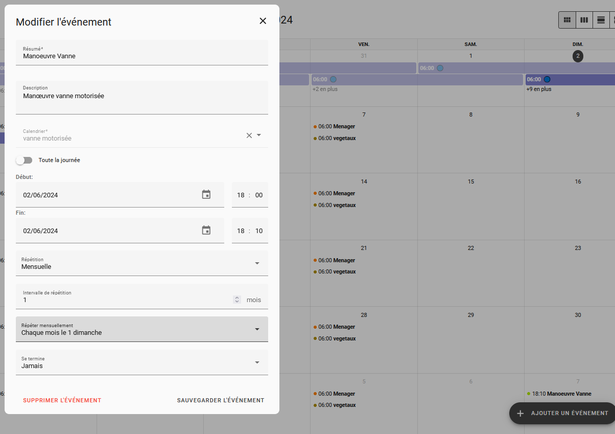 Le but est d’ouvrir une vanne motorisée pendant 1 minute, puis la refermée. Ceci une fois par mois le 1ᵉʳ dimanche entre 18H00 et 18H10.