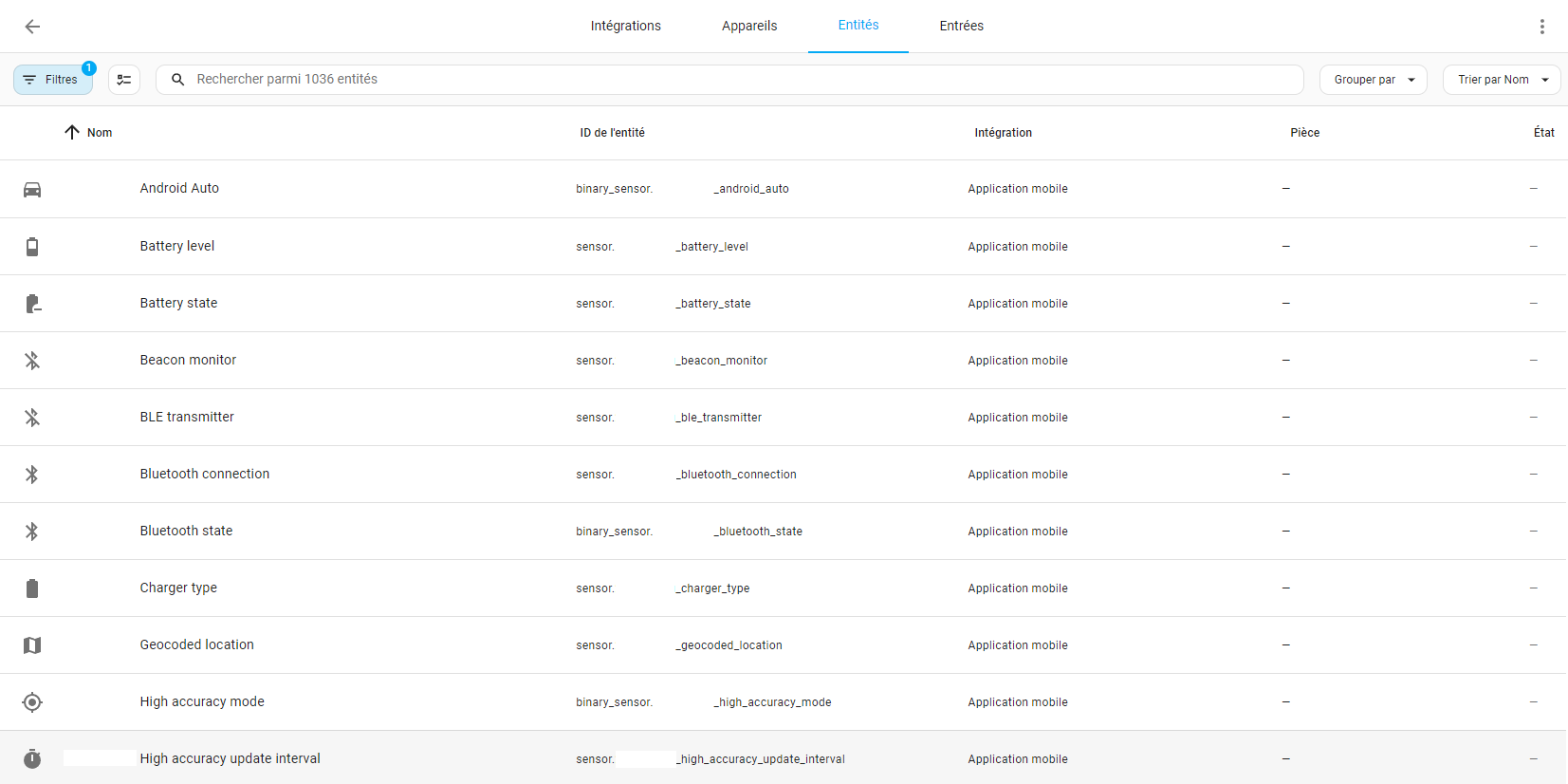 Là j’ai la liste des entités en lien avec mon téléphone :
