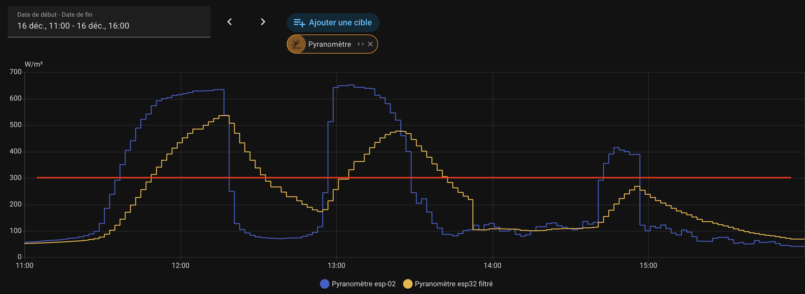 Exemple : j’ai un pyranomètre qui baisse ou lève les volets roulants selon que l’on passe ou pas la barre des 300 W/m2.