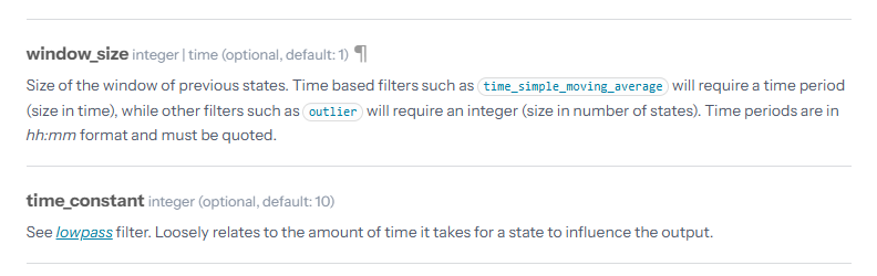 Taille de la fenêtre des états précédents. Les filtres basés sur le temps, tels que time_simple_moving_average, nécessitent une période (taille en temps), tandis que d'autres filtres, tels que outlier, nécessitent un nombre entier (taille en nombre d'états). Les périodes sont au format hh:mm et doivent être indiquées entre guillemets.