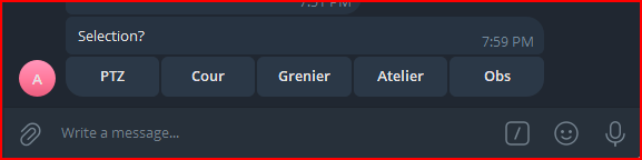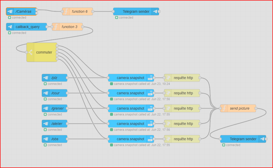 L’autre est utilisé via Nodered, soit pour afficher des messages avec des valeurs d’info, soit en interactif, je tape /camera, il m’affiche des choix pour chaque caméra et j’en sélectionne une et j’obtiens un snapshot de cette caméra.