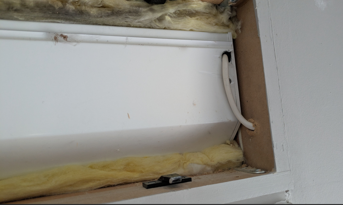 Je trouve bien le coffre du volet roulant et un seul câble d’alimentation qui en sors pour disparaitre immédiatement dans l’ossature bois, derrière le placo :