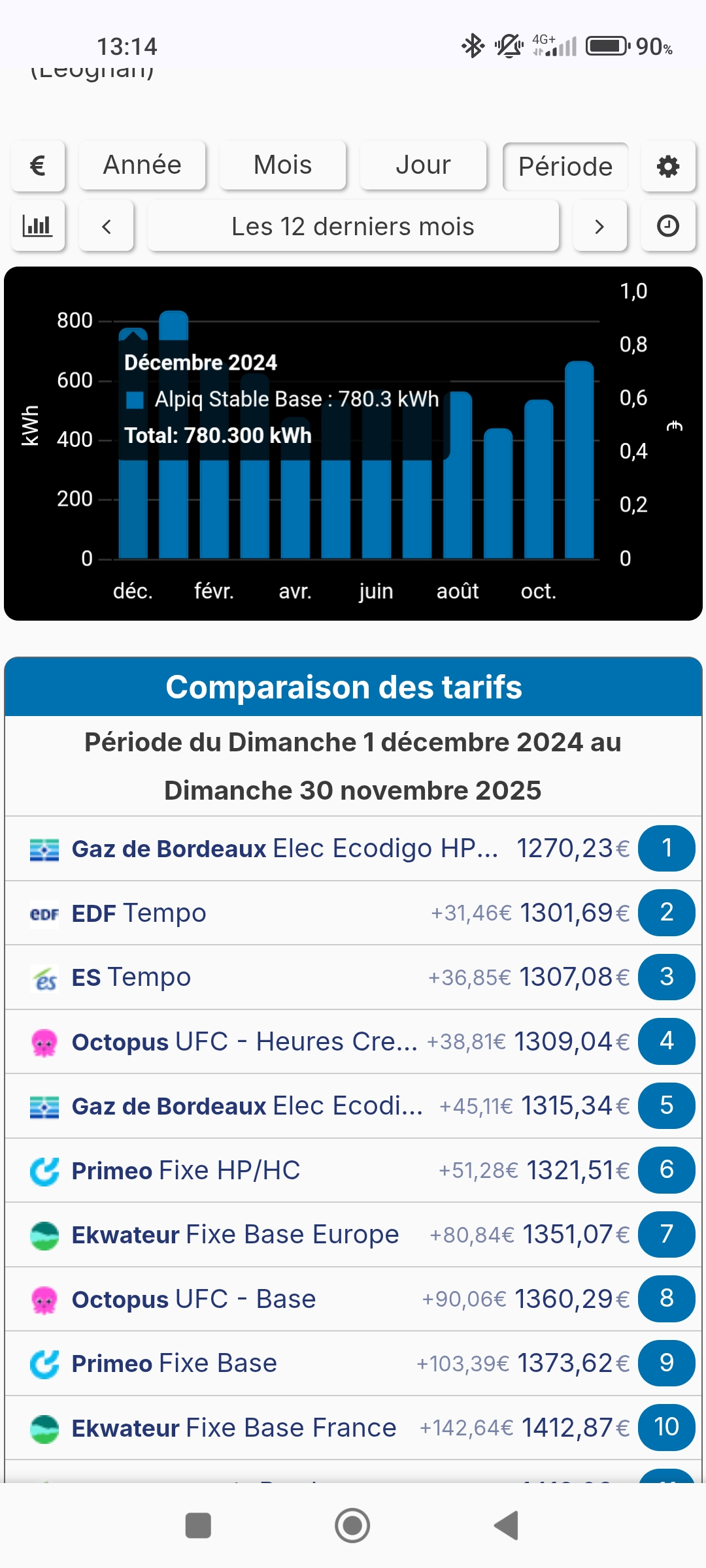 En gros j’aimerais comparer sur l’année passée avec le forfait Octopus d’UFC que choisir qui a l’air moins cher que Tempo à première vue d’après leur estimation. Je voudrais vérifier avec ma conso réelle.